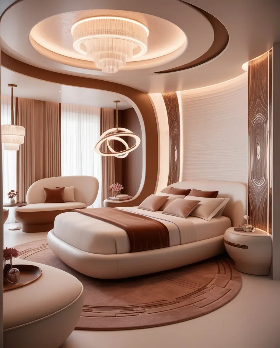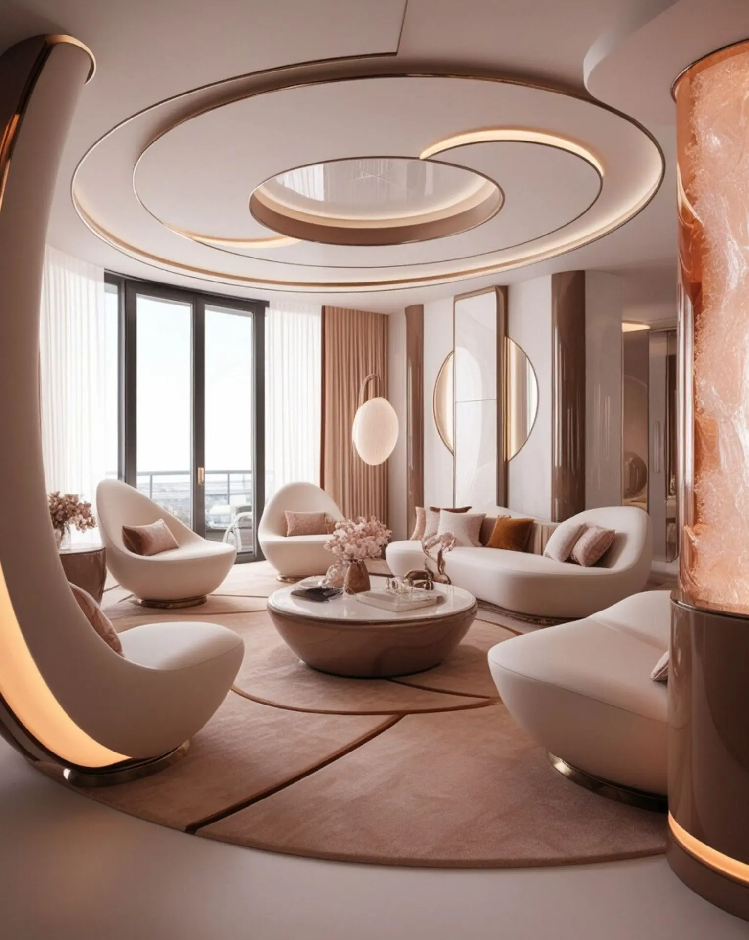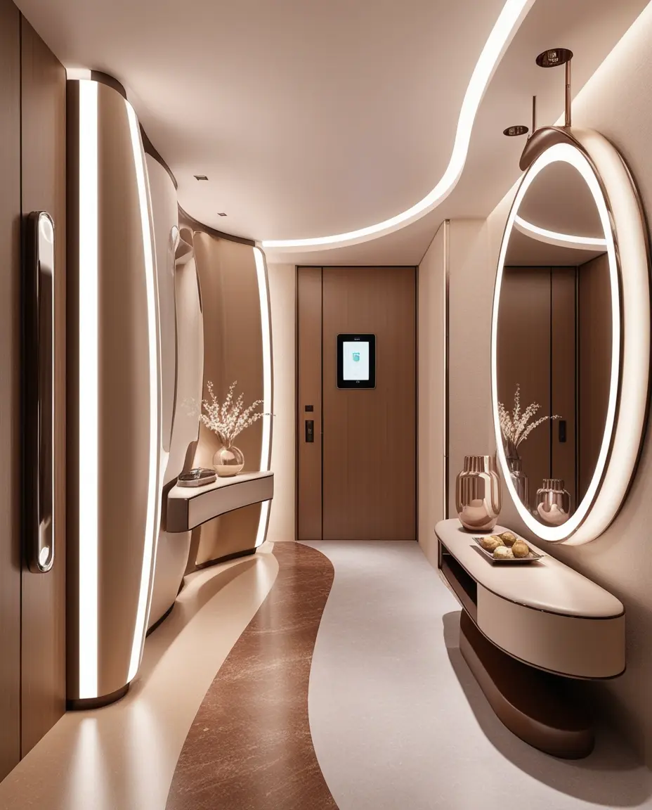 تميز التصميم الداخلي للشقة بالاعتماد على خطوط تصميم منحنية، ألوان محايدة مع لمسات معدنية، وإضاءة مبتكرة تبرز الطابع المستقبلي. تم استخدام تقنيات ذكية لتوزيع الإضاءة بما يخلق إحساسًا بالاتساع، مع انتقاء مواد عالية الجودة ومستدامة مثل الزجاج المعاد تدويره والخشب الصديق للبيئة. كما أضفنا عناصر ذكية مثل الأثاث متعدد الوظائف لتعزيز مرونة المساحة دون التأثير على المظهر العام.