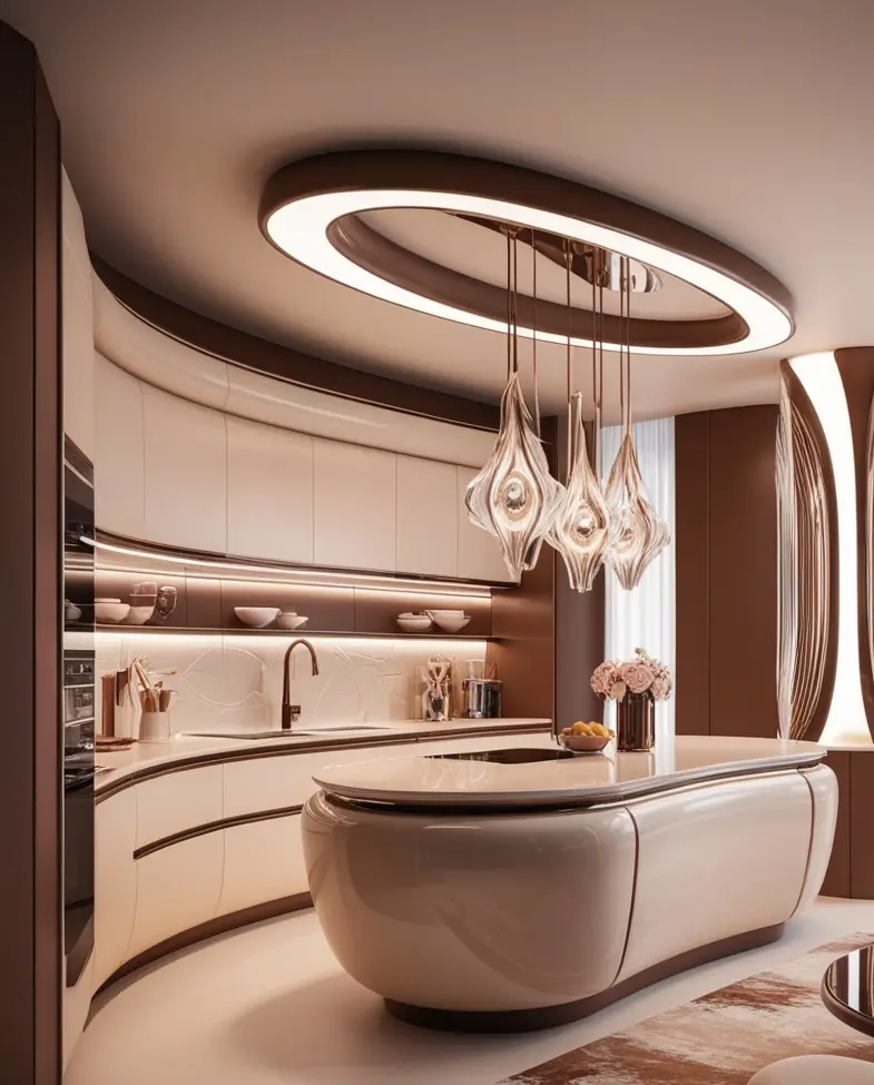 كان أحد التحديات الرئيسية هو دمج التصاميم المنحنية، مثل الجدران المنحنية والأثاث ذو الحواف الدائرية، داخل المساحة الصغيرة للشقة. هذه التصاميم تضفي طابعًا عصريًا ومستقبليًا لكنها قد تقلل من كفاءة استغلال المساحة إذا لم تُنفذ بدقة.