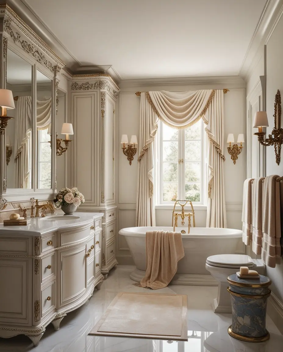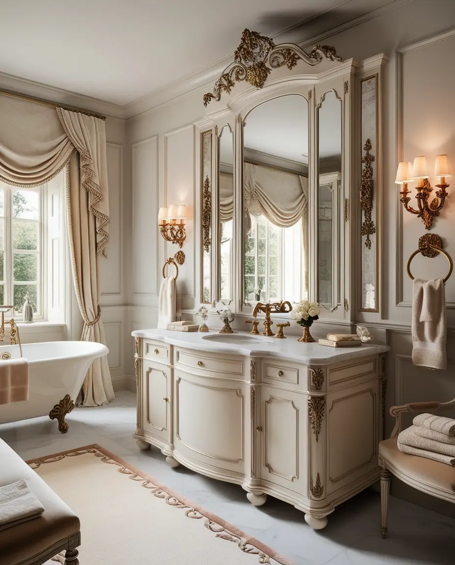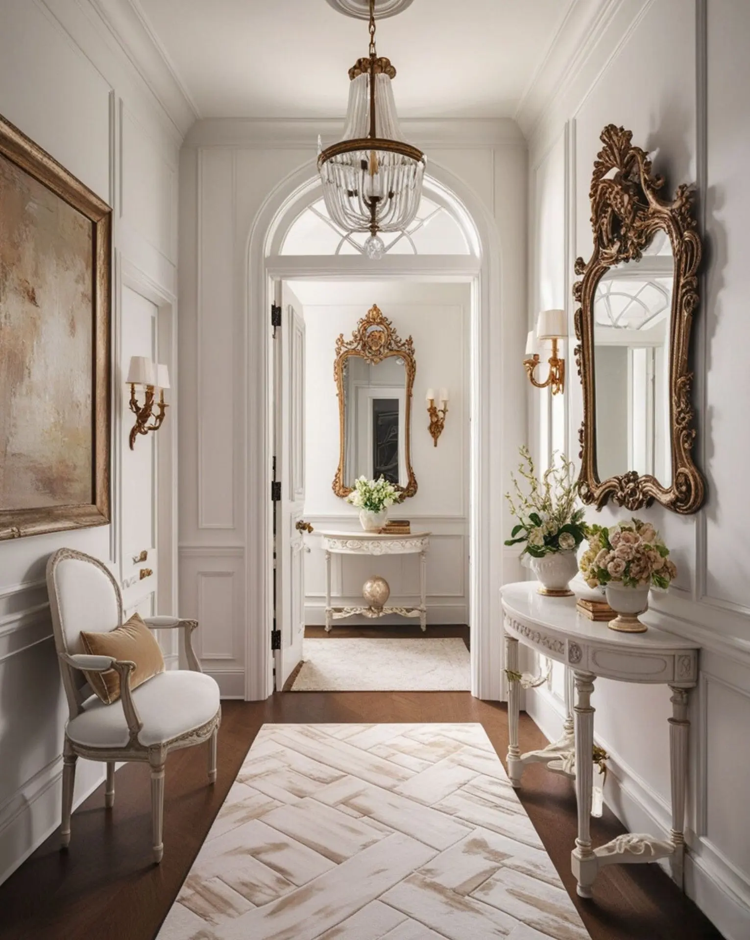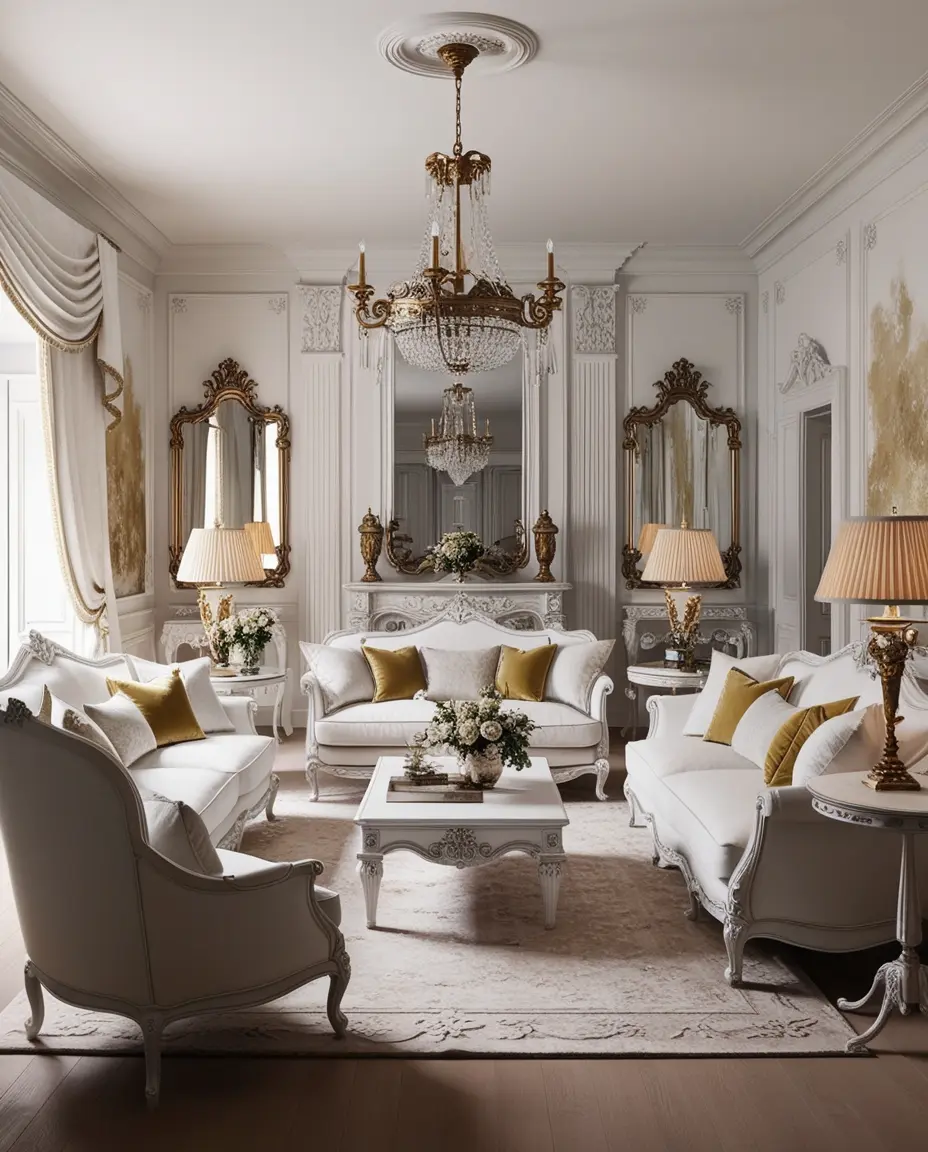 - توظيف المرايا الكبيرة المزخرفة: لتعزيز الشعور بالرحابة والعمق، مما جعل المساحة تبدو أوسع وأكثر فخامة.